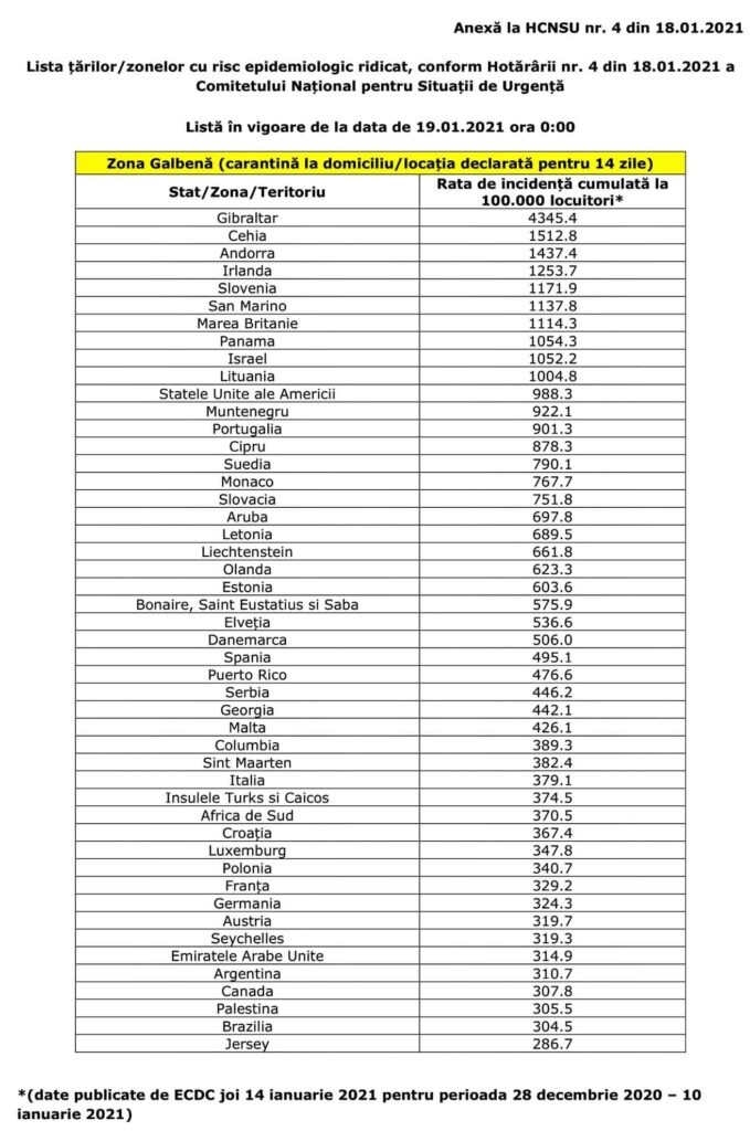 Art.1 – Se aprobă lista țărilor/zonelor/teritoriilor de risc epidemiologic ridicat pentru care se instituie măsura carantinei asupra persoanelor care sosesc în România din acestea, prevăzută în anexa la prezenta.