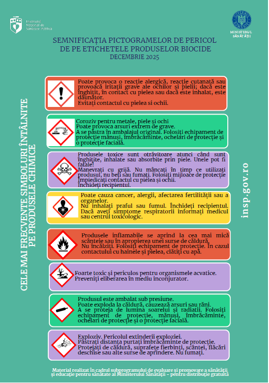Institutul Național de Sănătate Publică (INSP), împreună cu Direcțiile de Sănătate Publică Județene, derulează, în luna decembrie, activități de informare cu tema „Protejează-ți sănătatea, respectă mediul — folosește biocidele responsabil!”, dedicate populației generale, prin care se aduce în atenție modul corect de utilizare a dezinfectanților și altor produse biocide.