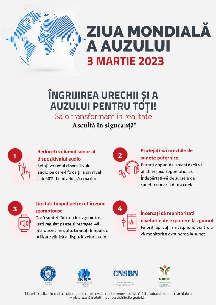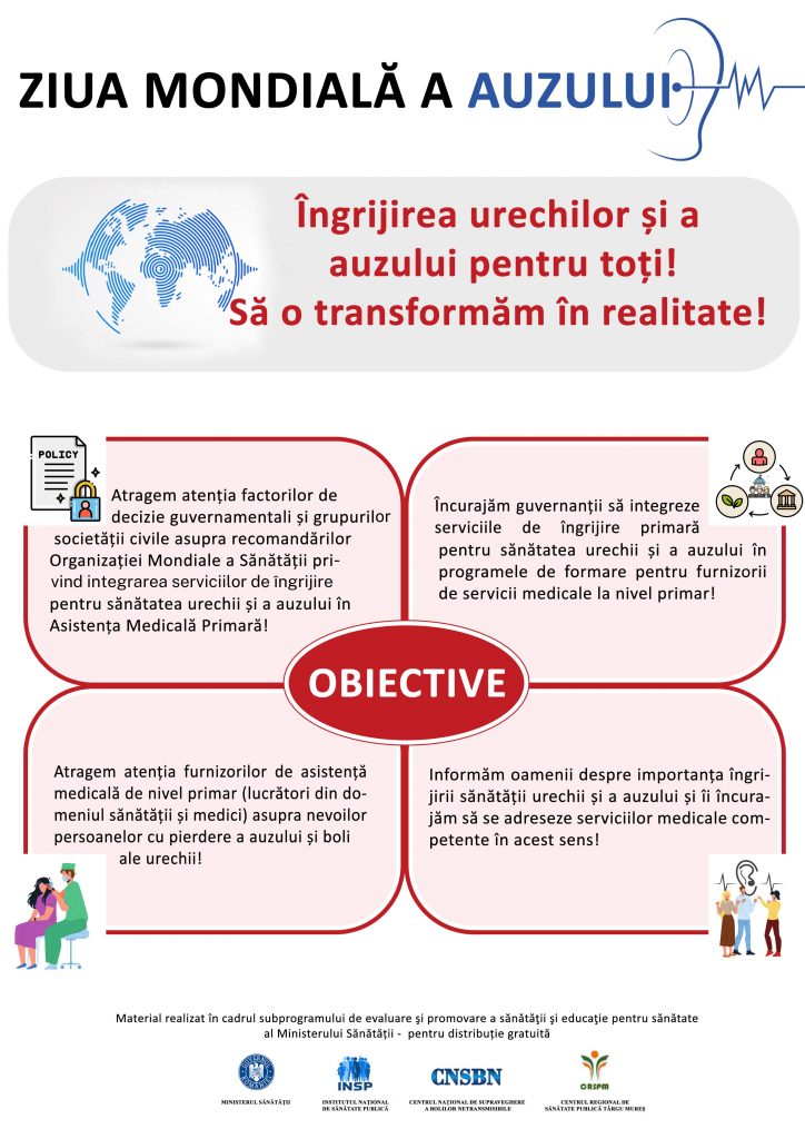 - informarea persoanelor despre importanța îngrijirii urechii și a auzului și încurajarea lor de a accesa serviciile medicale specializate în acest domeniu.